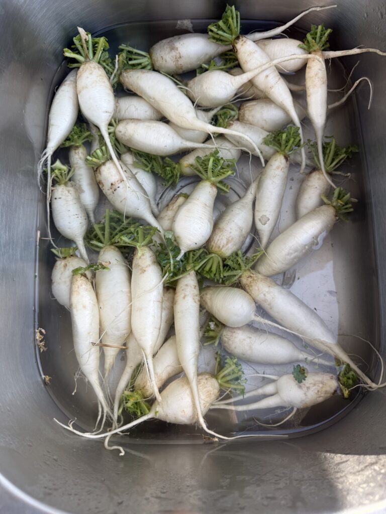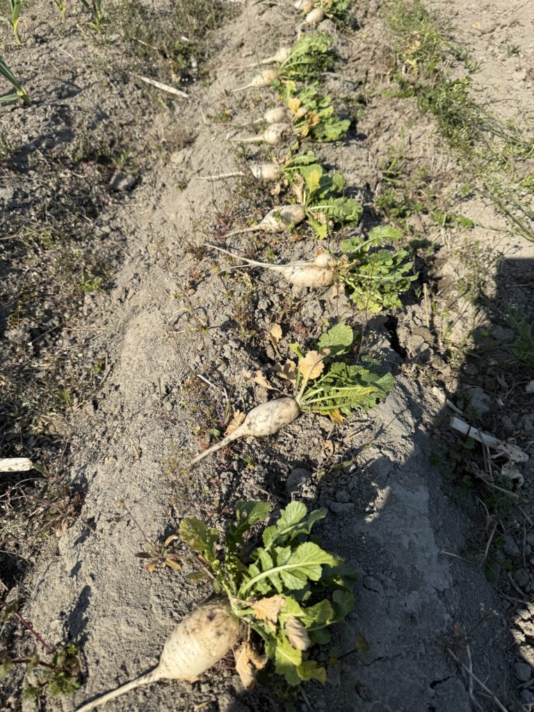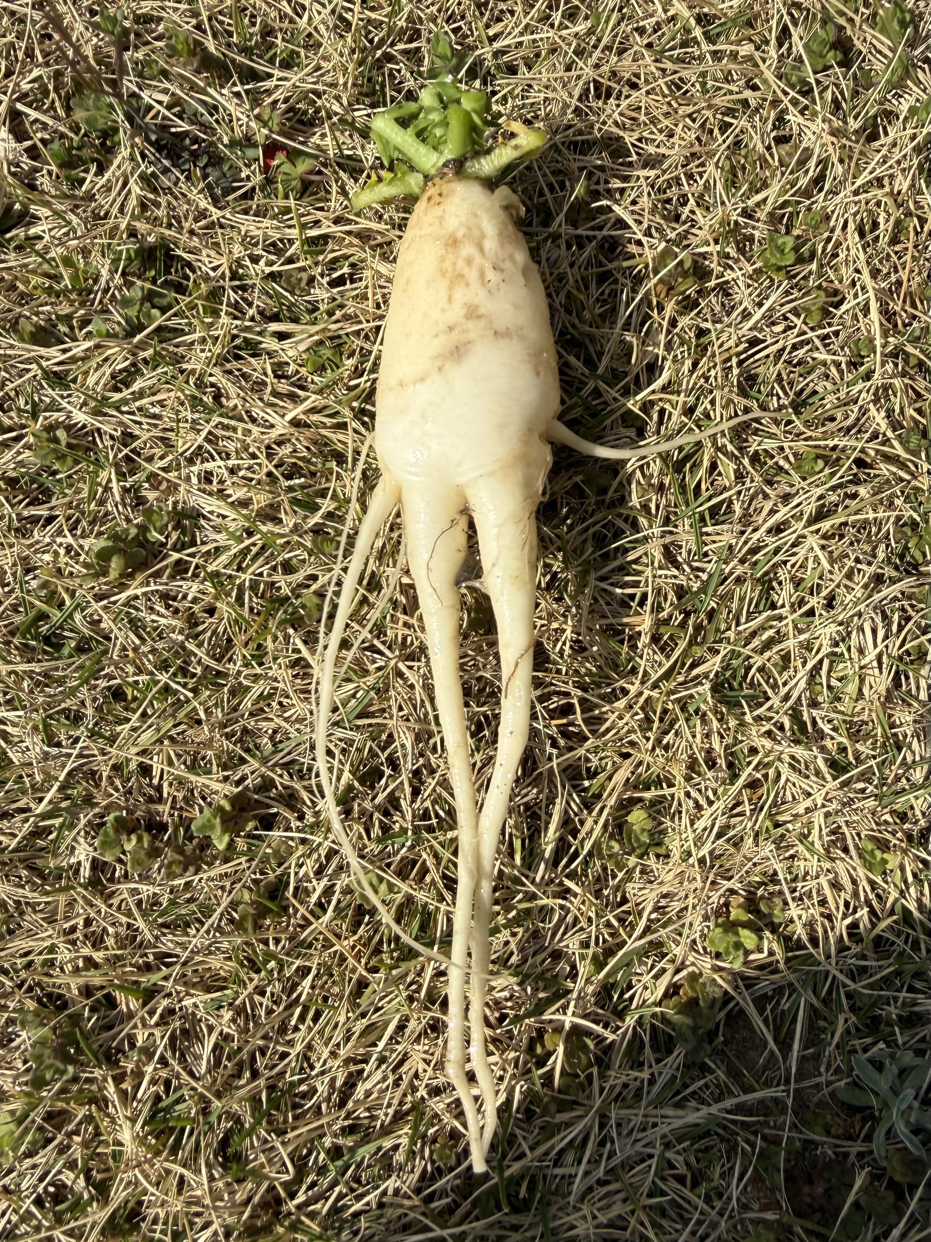 秋に大根のたねを蒔いて、ほったらかしにしていました。雨もほとんど降らず、草と同化していて成長もしていません。春になって来ましたので、菜の花が咲く前に、収穫して、大根おろしや一夜漬けなどにして食べたいと思います。小さいながらも、味は大根です。🤪 それと、変形大根もありましたので、写真を撮ってみました!!!!