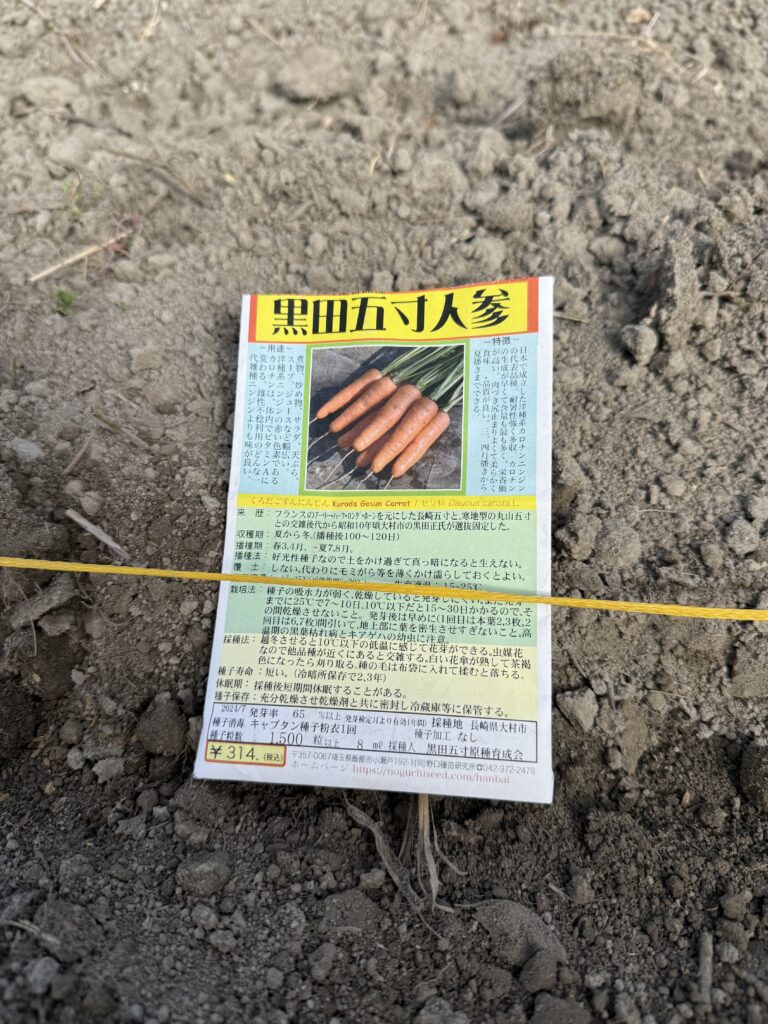 次に、今回は、大根(三富・青丸紅芯大根)にんじん(黒田五寸人参)カブ(白鷹)の4周類を種まきしてみました。何回か種まきして、食べては見ましたが、味はまあまあでして、発芽率も悪くないので、この種類にしています。4月になると草🌱と虫🐛との戦いが控えていますが、頑張って畑仕事行いたいと思います。発芽したら、不織布をかけて、虫除けも有効なので、その時考えたいと思います。🤪